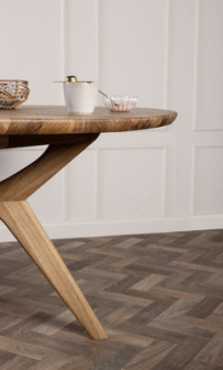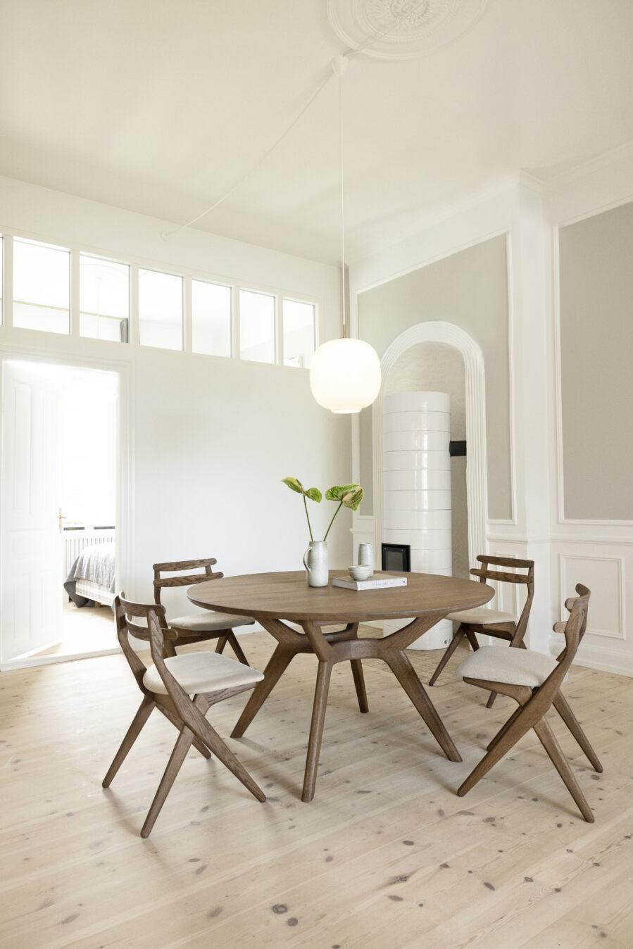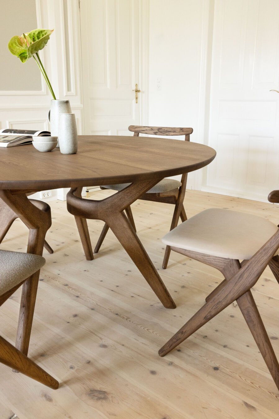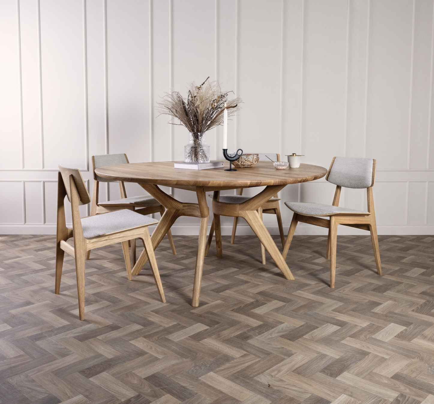 Amelia spisebord fra Kristensen & Kristensen. Amelia er oppkalt etter den første kvinnelige piloten som fløy over Atlanterhavet. Bordet har myk en utførelse med stødig holdning i heltre. Amelia har myke linjer og er helt uten skarpe kanter som gir bordet et elegant og tidløst utseende. Bordet kommer i heltre ask eller eik, i en rekke størrelser, og farger, med og uten tilleggsplater.