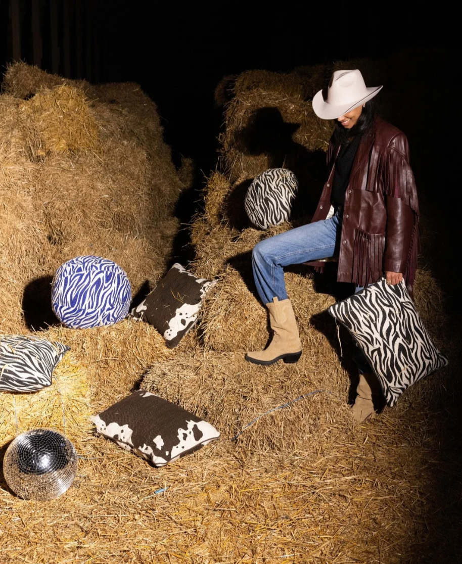 En luksuriøs pute i bouclé med markant sebramønster i svart og hvitt. Den taktile teksturen og den grafiske kontrasten gir et uttrykk av både eleganse og lekenhet, og løfter helheten i sofaen eller på sengen.