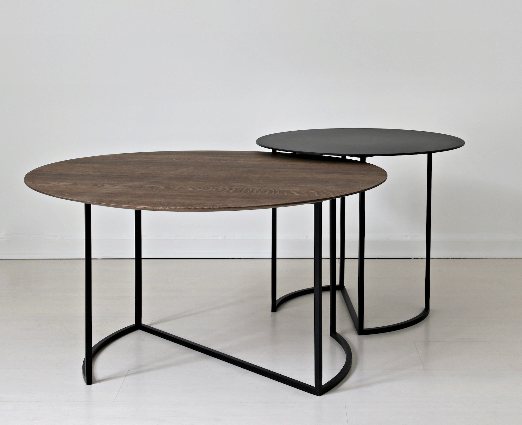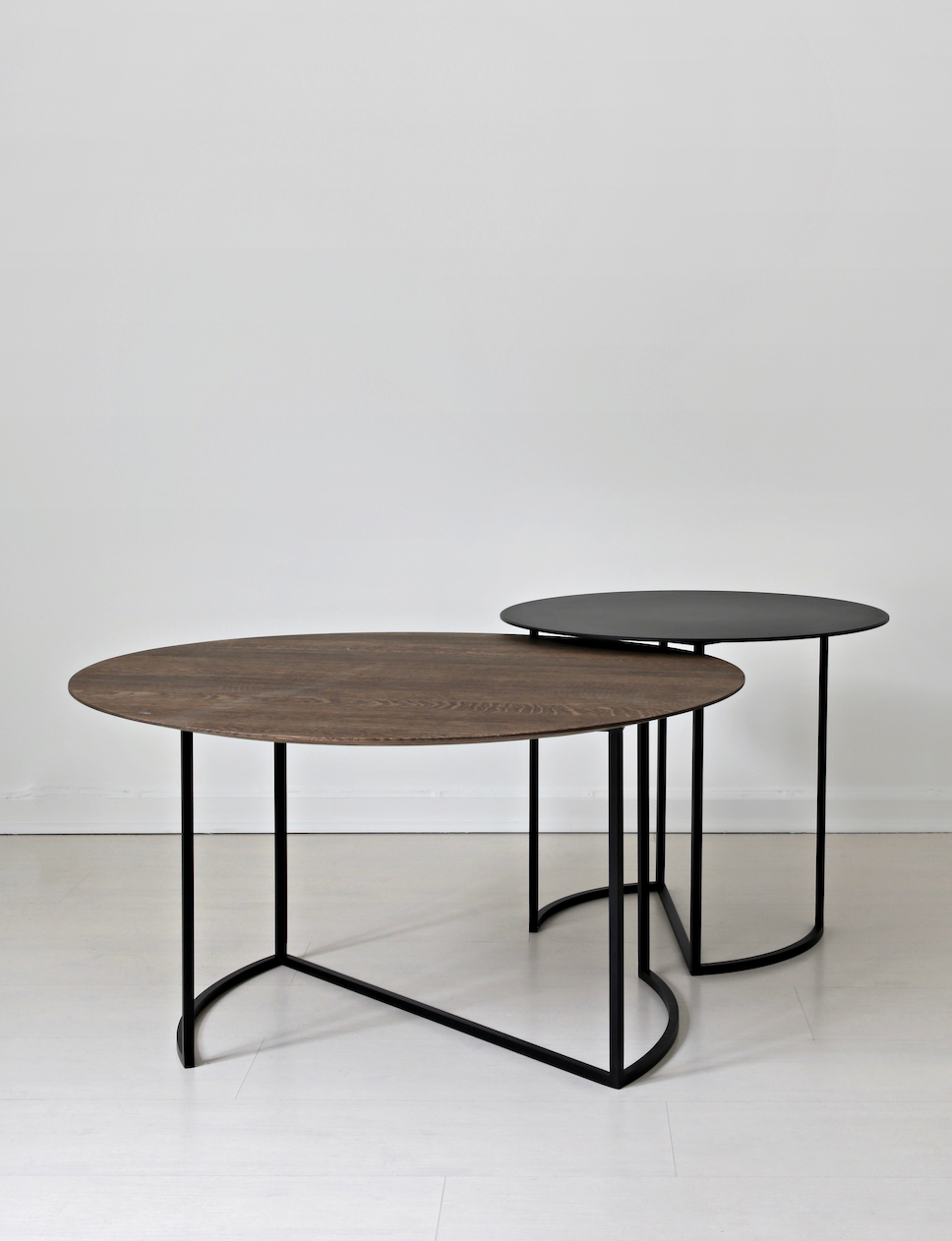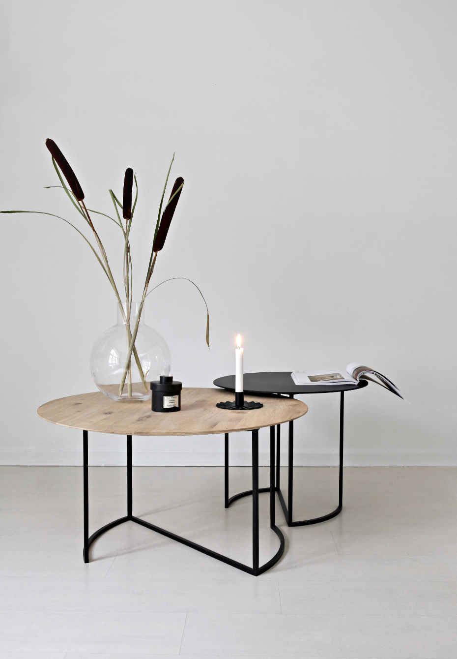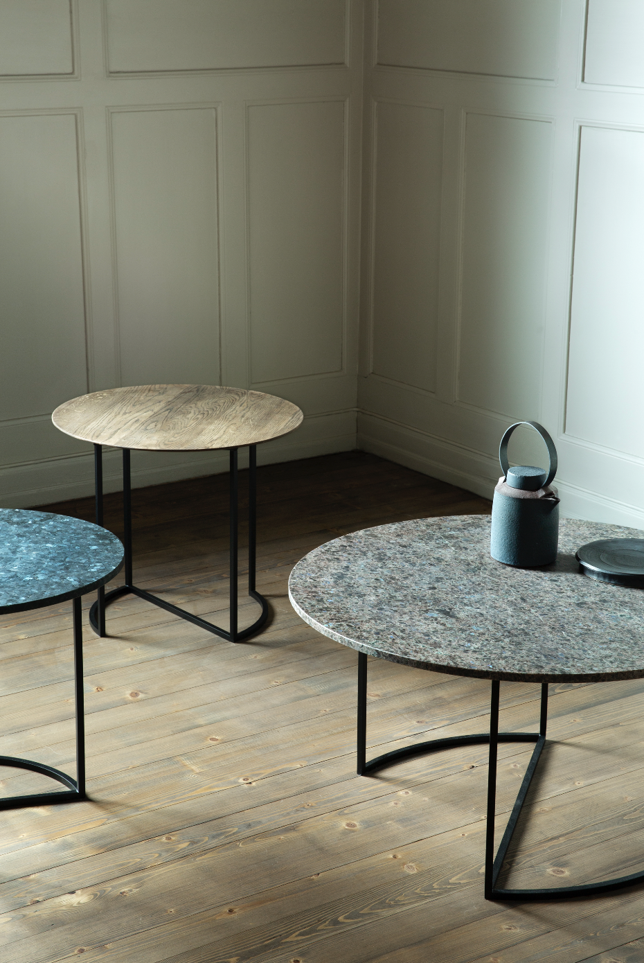 Den slanke rammen i svart pulverlakkert stål bærer en delikat, rund bordplate som kommer i flere material- og fargealternativer. Du kan velge mellom matchende svart stål, massivt vill-eik i ulike finish, eller ekte norsk stein fra Lundhs.