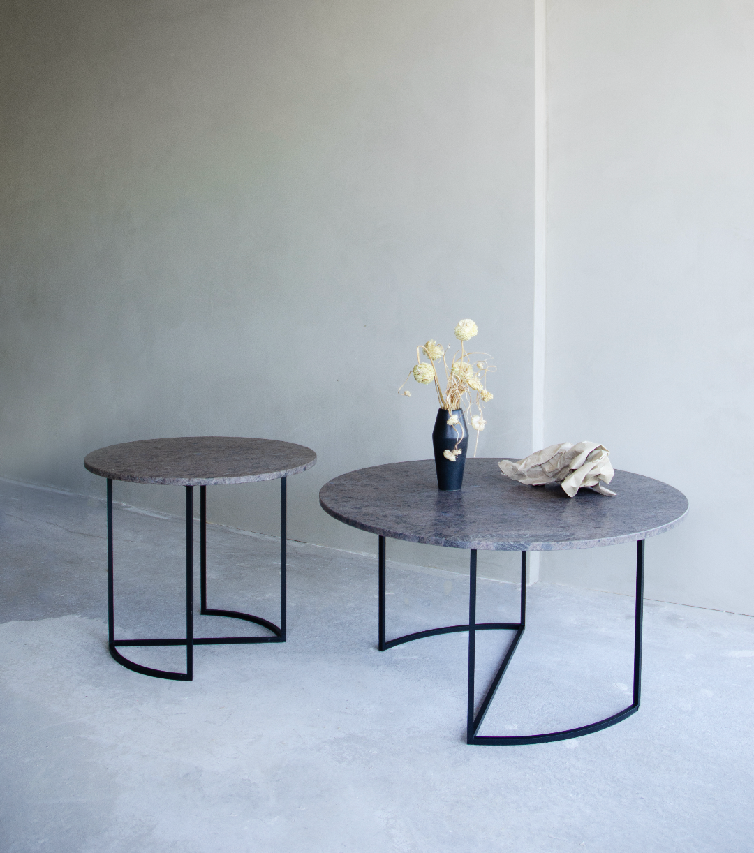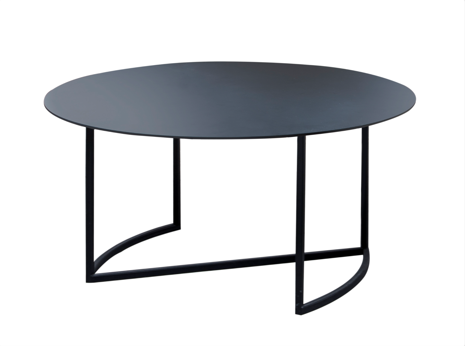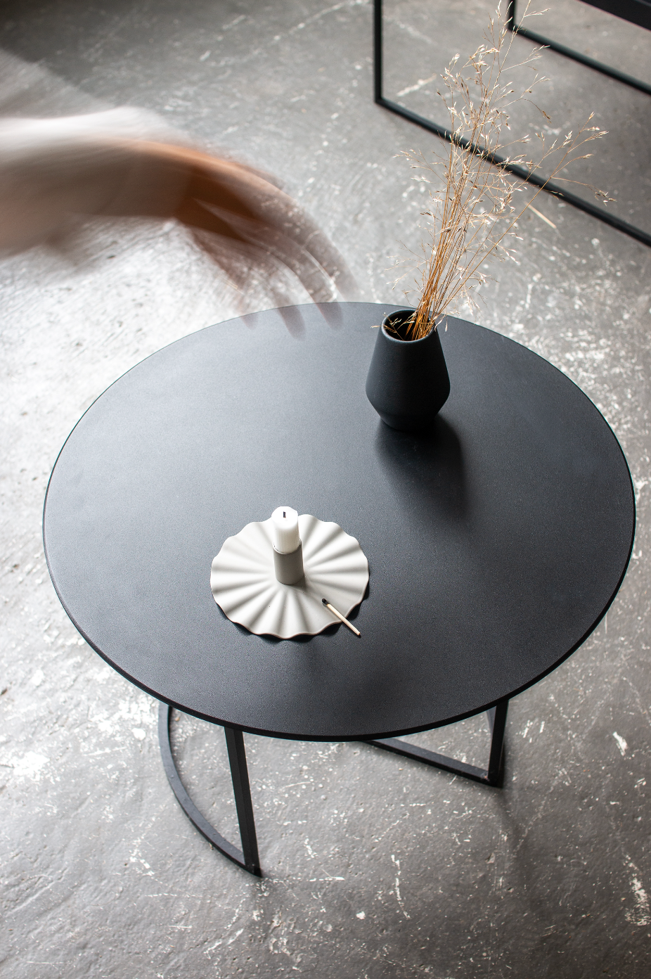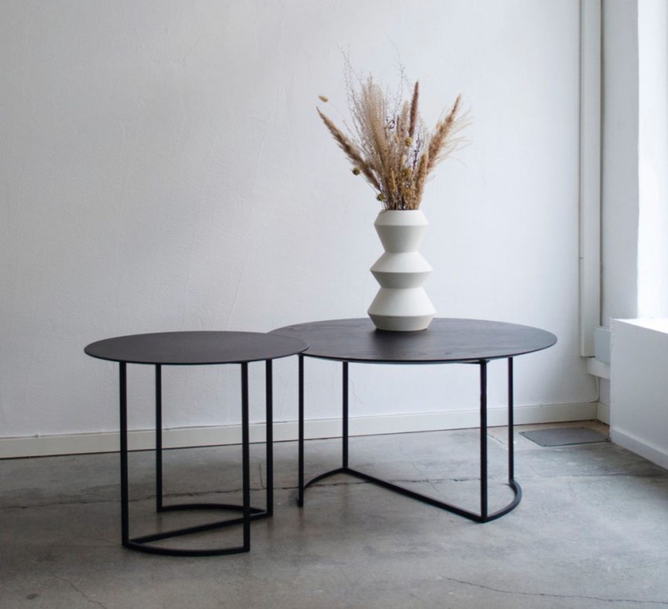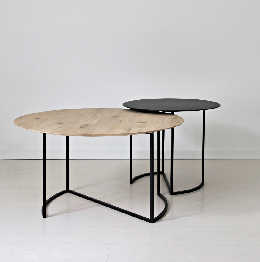 Den slanke rammen i svart pulverlakkert stål bærer en delikat, rund bordplate som kommer i flere material- og fargealternativer. Du kan velge mellom matchende svart stål, massivt vill-eik i ulike finish, eller ekte norsk stein fra Lundhs.