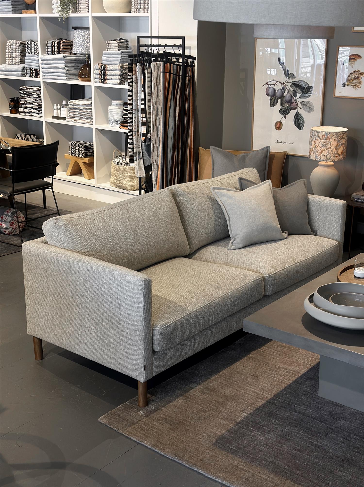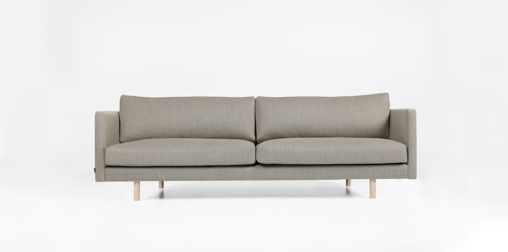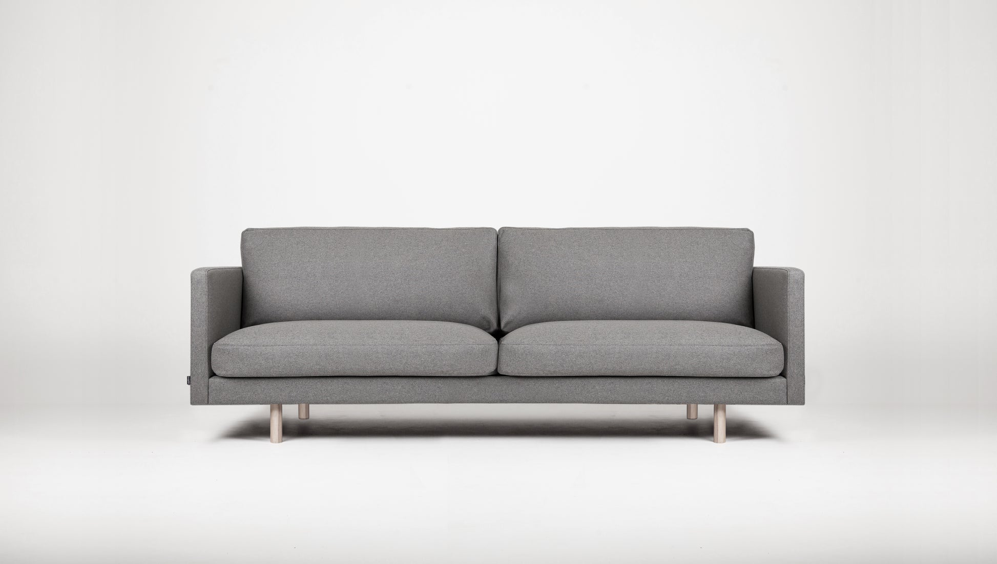 Svev sofa fra Ygg & Lyng. Tidløs og moderne på samme tid, passer den inn i ethvert interiør. De komfortable, koselige og tykke dunputene står i kontrast til de slanke og rette linjene på rammen. Sofaens karakter endres av ditt valg av stoff; gjør den nordisk og varm med naturlig ull, eller dramatisk med fløyelsstoffer. Plasseringen av de solide eikebena gir den et svevende uttrykk. En alternativ plassering av bena i hjørnene er også mulig.